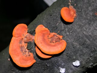 【左】森にモリチャバネゴキブリがいました。これは森しか住めません。 【右】ヒイロタケです。染料に使います。