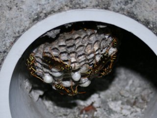 【左】水抜きパイプの中にアシナガバチの巣がありました。