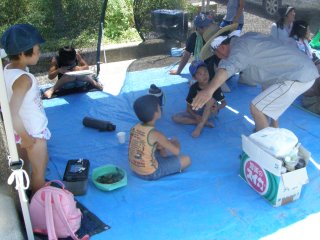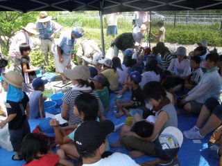 川から上がり、一休みの後今日見つけた生き物の分かち合いをし、地球温暖化が進む中、自然の仕組み、自然の大切さ、