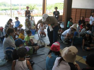 朝から快晴の暑い日。梅の館での受付を終えて、主催者側の「生き物と自然と命の大切を体験しましょう」の挨拶の後、観察会のメンバーから