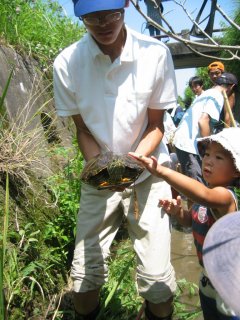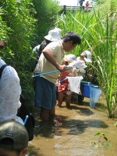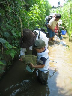 数分もすると、あちこちで ザリガニゲット!オタマジャクシゲット!ドジョウだー 、これ何!など等、歓声上げながら、川と生き物との出会いを