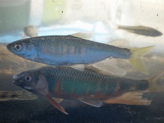 【左】オイカワの雄と雌、虹色の濃いほうが雄です。