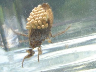 【左】採集した生き物の分かち合い。  【右】コオイムシ。お父さんが卵を背負っている。