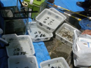 【左】生き物別にバットに入れました。