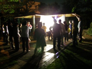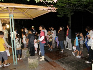 曇天で雨が降りそうでした。それでも町内各地からたくさんの方が集まりました。ホタルの発生のピークは過ぎたみたいでしたが、たくさんのホタルが観察できました。昨年、灯火に集まる虫の観察を行ったところ人気がありましたので今年も準備しました。雨が心配でしたので公園の東屋を利用しました。昨年い比べたくさん集まってきました。子供も大人も随分喜んでいました。(記・降幡)