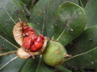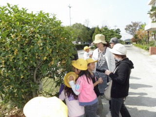 【左】キンモクセイの香りを嗅ぎました。 【右】白い実(ナンキンハゼ)が顔を出していました。これを小鳥が食べます。