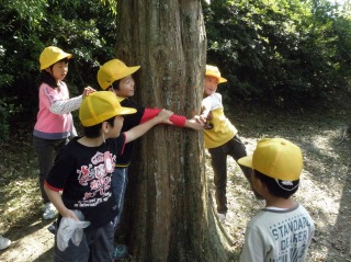 【左】色々な木の肌があります。触ってみましょう。 【右】メタセコイヤは二人では足りませんでした。