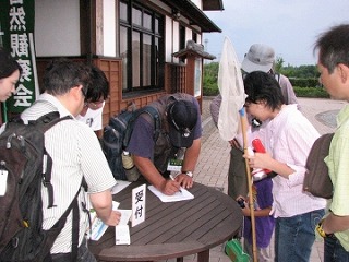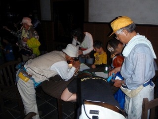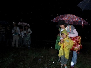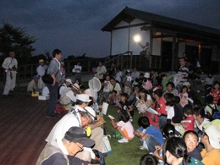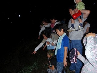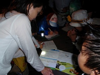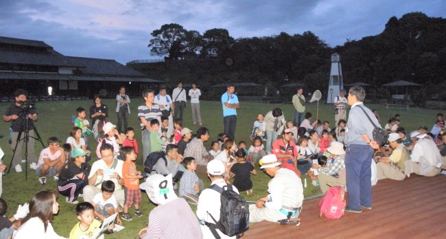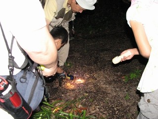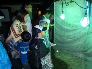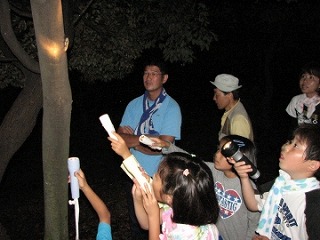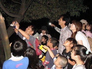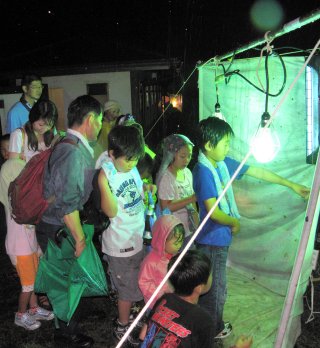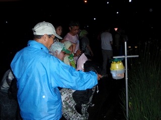 今回は第一回目で知多市梅の館周辺で曇天の中、たくさんの参加者が集まりナイトハイクをしながら、ホタルや灯火に集まる虫の観察をしました。開会の挨拶の後、ナイトハイクに出掛け、コナラ、ヤナギなど樹木に集まる虫を懐中電灯を照らして観察しました。樹木の樹液が出るところにキマワリ、ダンゴムシ、ユミアシゴミムシ、カナブンの仲間が見られ、子供たちは大喜びでした。小雨が振り出した中、佐布里池の堤下まで移動し、ヘイケボタルを観察しました。ホタルの数は少なかったですが自然の中で毎年発生することを紹介しました。最後に梅の館に戻り、水銀灯で灯火に集まる虫を観察する装置のところに行き、集まった虫の観察をしました。虫好きの子供がたくさんいて小雨が降る中、熱心に観察していました。 (記・降幡 )