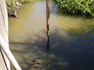 8月29日 午前9時 知多市地域文化センター 集合。金内さん センターの林さん 高橋の3人で下見をしてきました。林さんに水路脇の雑草を刈って頂き梯子をかけ 水路の観察をしました (記 高橋)