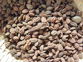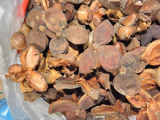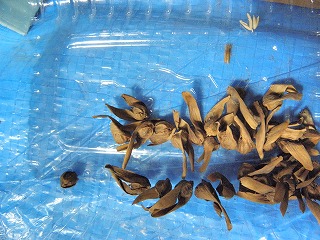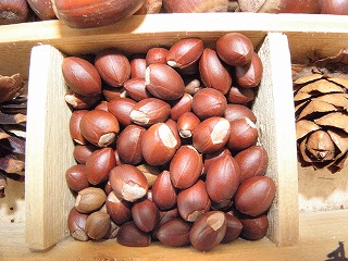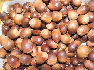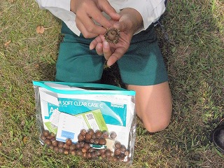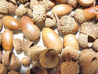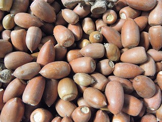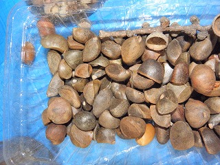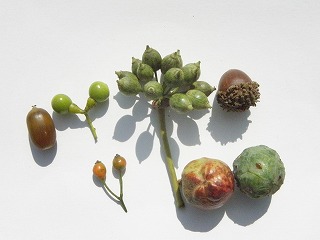 【右】木の実⇒上段、左からアラカシ、クスノキ、カクレミノ、クヌギ、下段、ノイバラ、ツバキ、ミズスギ