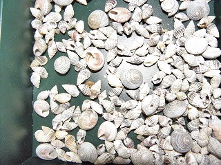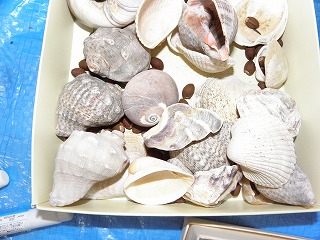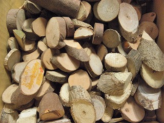 【左】木のスライス 【中】大きな貝殻 【右】小さな貝殻
