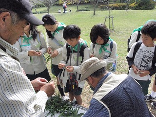 川でカダヤシやメダカを観察し、川辺に生える、トチカガミは、準絶滅危惧種であることを知ると、皆驚いていた。キノコが沢山見つかり、毒か?食べられるか?が、すぐに話題となった。どのグループも、大変熱心に、自然観察に参加していた。途中、笹で舟や飴を作ったり、イヌマキで手裏剣を作ったりして遊んだ。今年はドングリの 落下が、遅くて心配していたが、クラフト工作の材料は、十分集まった。一番のお気に入りは、手裏剣のようで、食事の後も男女とも、張り切って、手裏剣で遊んでいた。