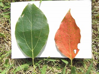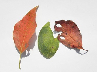 【左】とげとげの葉⇒ミズスギ 【中】虫の食べ跡⇒左からクスノキ、ツツジ、サクラ