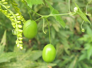 【左】イノコヅチ 【中】ヤマノイモのムカゴ 【右】枝についたミミズバイの果実