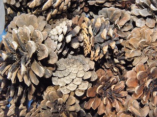 【左】ナンキンハゼ 【中】マツボックリをリスが食べた跡 【右】アラカシの葉
