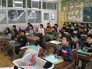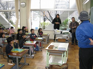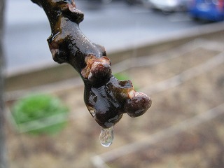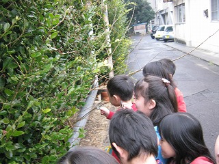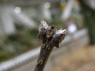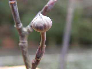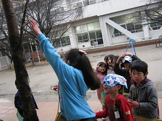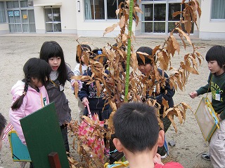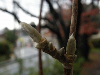 午前8時過ぎに飯嶋先生より「ふゆめたんけんたい」決行の電話が入りました。まず1組を9時50分から30分間、2組は10時50分から30分間、3組は11時30分から30分間観察する予定になっていました。1組開始前から小雨が降り始め2組の時はしばらく止んでいましたが3組の時にまた降り出すという悪条件になりました。最初に教室で冬芽の簡単な説明をしてから校庭に出ました。時間が短いので特徴のある冬芽をピックアップして観察することにしました。トチノキの冬芽のねばねばやモクレンの毛に覆われた冬芽などさわってみました。オオムラサキの花芽、ふくらんだウメのつぼみも観察しました。雨と寒さで震えている児童もいて気の毒に思いました。(少し走りましょうと早足で移動しました)