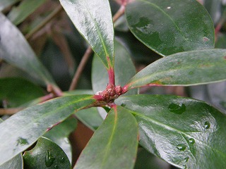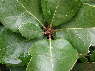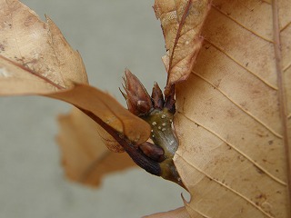 【左】クヌギには枯れ葉が付いている。 【右】イスノキに虫こぶがあるよ