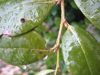 クロマツ、ヒメコマツ、イチイ、イスノキ、マテバシイ、サンゴジュ、マサキ、サザンカ、ツバキ、サツキ、オオムラサキ、ヤマモモ、ウバメガシ、アラカシ、スダジイ、クロガネモチ、アオキ、ユズリハ、タブ、ヒサカキ、イヌツゲ、ネズミモチ、タイサンボク、モッコク