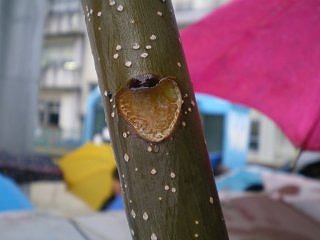 3組の終了間際になってそれまで気付かなかった葉痕がハート形をした木を見つけました。ハート、ハートと寒い雨の中で少しだけ暖かく盛り上がりました。その時は木の名は分からなかったので写真に撮りました。(記・大野 )