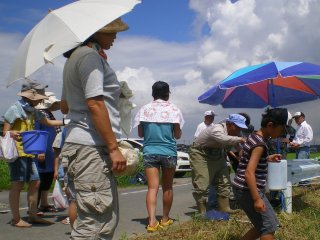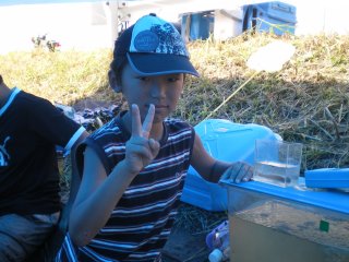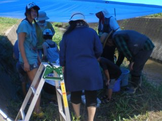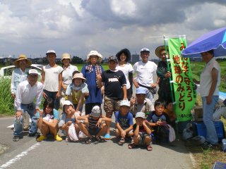 寺本台子供会恒例の、野崎川の観察会です。役員の方が、前日から、川にブルーシートをセットして下さり、この下は、猛暑にもかかわらず、川の中も、土手も涼しく、快適に活動することが出来ました。このご配慮に感謝しております。前日に、少し雨が降ったせいか、魚が沢山泳いでいて、全員が、魚を捕ることが出来、大喜びでした。今や高価なウナギや、ナマズを捕らえると、大歓声!前日には、30p位のウナギが、3匹捕まったそうです。毎年沢山いるドジョウが少なかったのは、残念でした。毎年行っている、子供会行事ですので、子供達は、意欲的に行動していて、すばらしいことだと思いました。収穫した魚の説明中、コオイムシが、ボラの稚魚のエラから血を吸い始め、貴重な場面に、ビックリです。終了後、子供達に感想を聞くと、皆うれしそうに、口々に「楽しかった」「魚が沢山いて、魚と1対1で、向かい合っているようで、楽しかった。」と言う声でした。通りがかった、前の役員さんから、大きなスイカを、3個も差し入れして頂き、野崎川と田んぼを眺めながら、全員でご馳走になりました。「すごく美味しい!」「こんなにおいしいスイカ初めて!」と歓声!そのはず!ブルーシートの下で、冷えたスイカ、すばらしい自然の景色を眺め、スイカの種飛ばしをしながら、かぶりつくスイカの味は、最高でした。皆、初めての経験でしょう。記念撮影をして家路に着きました。(記・吉房)