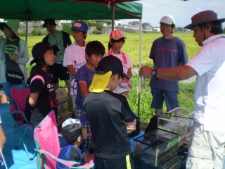 魚が隠れていそうな場所、タモを使っての魚の取り方などの説明の後、丸型のタモは川底にうまくつくように変形をし、川に入って魚獲りをしました。砂地の所、泥の所、草が生い茂っているところなどがあり、楽しく採集することができました。