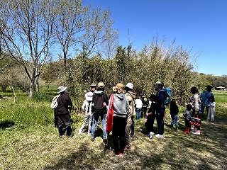 桜は満開を過ぎ葉が出始めて桜吹雪の後が見られた。先週よりタンポポの花の数が増え、タンポポブーケやタンポポ綿毛ブーケを作っている子もいた。朝は少し風が冷たくも感じたが、日が照ってくると暑さを感じるほど。2種類のアケビの花は満開近く。コナラの新芽は1週間で大分黄緑の量が増えた。ウグイスが近いところで気持ちよさそうにさえずっている。ワラビは少ないが初めて採るという親子がいた。切り口をかじって粘りと癖のない味にびっくりしているお母さんがいて、何でもやってみようという意欲が感じられた。