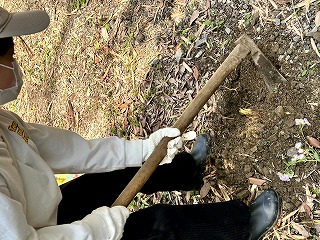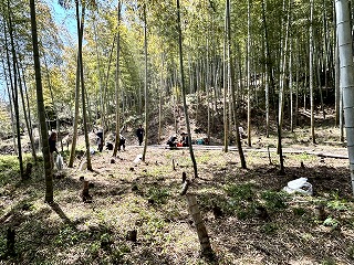 9時半に駐車場に集合して、前半は竹やぶの中においてある竹を運んで整備するグループ(お父さんが多かったような・・・)と、子供たちと一緒に春の野山で草花や木々の新芽、生き物探しをするグループに分かれた。9時50分頃に集合がかかり、少し説明があった後、グループごとに分かれて出発した。1時間ほどの作業(子供たちは観察会)と休憩を挟み、1時間ほどの竹の子掘りをした。