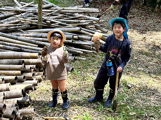 昨年度よりは竹の子の数は少ないものの、各家族が満足できるほどの竹の子を掘ることができた。力を入れて竹の子を掘るお父さん、掘る様子をみつめ竹の子を土から取り出す子供、掘った竹の子を袋に入れて持ち帰りやすいようにするお母さん、と、家族で力を合わせてやっている姿も見られた。掘った竹の子は?と聞くと、近所に配る、ばあちゃんにゆでてもらう、近所の人にゆでてもらっていくつかお礼にあげる。といった声が聞かれた。大きな鍋は現代家庭では台所にないことを感じさせる回答だった。どの家族も、春の味、竹の子を食べられるうれしさのためか、重い竹の子を軽々と持ってウキウキと帰って行くような気がした。 (記 竹内秀)