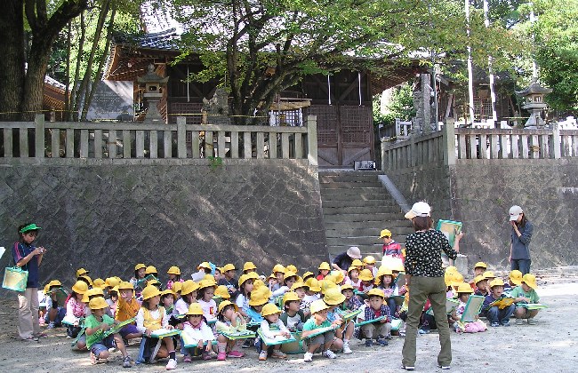 森岡小学校の直ぐ東にある村木神社でネイチャーゲームの代表的なメニューとなっているフイルドビンゴを行いました。内容は村木神社で確認できる項目で作成しました。子供たちは張り切って自然物との出会いを求めました。境内をかけめぐり次々と新しい発見をし、生き物に感激をしていました。