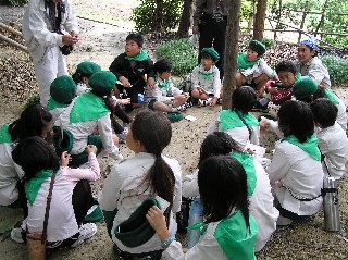 【左】午前・ネイチャーゲームで分かち合いをしています。
