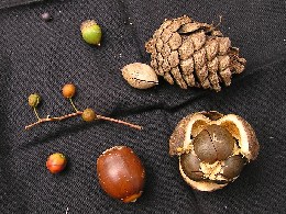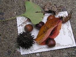 【左】別グループの木の実、ひとつ。アラカシ、イチョウ、マツカサ、エノキ、アベマキ、モチノキ、ツバキ。