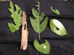 【左】だれかの食べ後、横から食べる虫と穴を空ける虫は種類が違います。観察してみましょう。