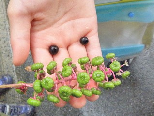 【左】ツルドクダミ 【中】ヤブツバキの実と種子 【右】ヨウシュヤマゴボウ