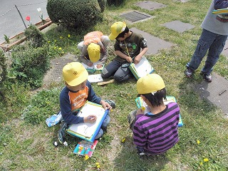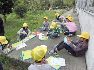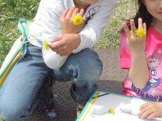 【左】鉛筆で木の葉の形を擦りだしています。 【中】タンポポの指輪が出来ました。 【右】最後にまとめと反省会をしています。