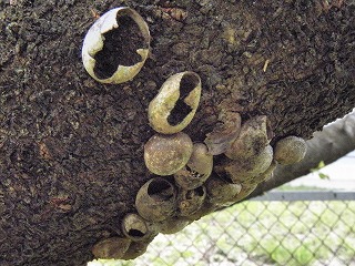 【左】ツチイナゴ 【中】セイヨウミツバチ 【右】ヒロヘリアオイラガの抜け殻