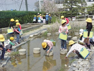 【左】オオイヌノフグリの花と実を観察 【中】池の生き物観察 【右】トウカイタンポポとセイヨウタンポポをスケッチしています。