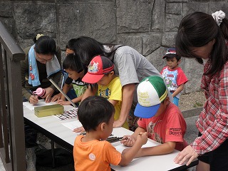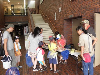 【左】受付、いらっしゃい       【右】熱心に注意と採集方法を聞いています。