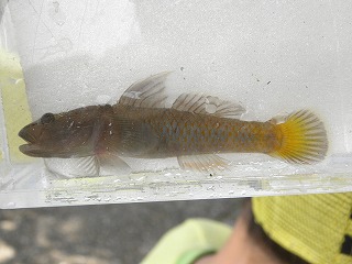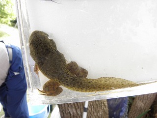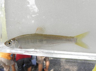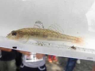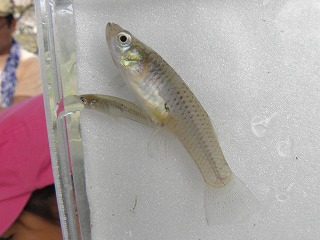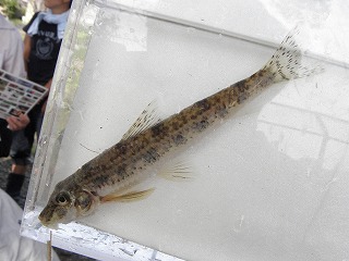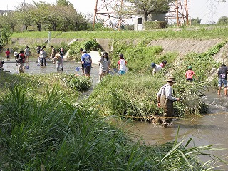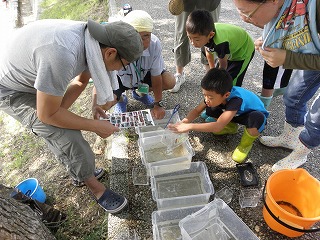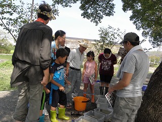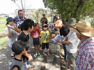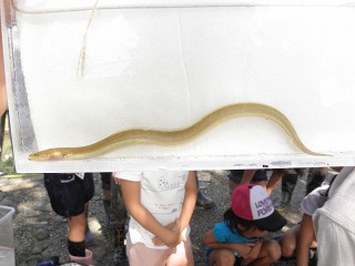はじめはなかなか魚が取れなかったが、こつをつかんでくると徐々に大きめの魚が取れるようになった。”魚だ”の歓声に、近くにいた人が”どれどれ、すごいね。”と応じる。それに触発されて、まわりのやる気がますます出てきた。”また、来たいね。”の声も聞かれた。暑かったので川の中は気持ちがいいし、小さい子でもカダヤシや小さなエビが網に入り、みんなが楽しめた。たくさんの人が一生懸命がんばったので、量は多いとはいえないものの、いろんな種類のさかながとれた。 10時45分ごろから、A,B,C3班に分かれて川の生き物について話を聞いた。オイカワやブルーギルの美しい色に魅せられたり、ウナギの元気のよさに驚かされたりした。2匹のウナギは大きくはなかったが、最近は貴重なだけに喜びもひとしおでした。魚を持って帰りたいとの希望も多かったが、外来魚の中には、飼うことや移動させることが許されない魚があることなどの理由を聞き納得することができた。(記・岩本 )
