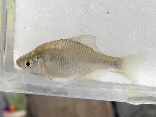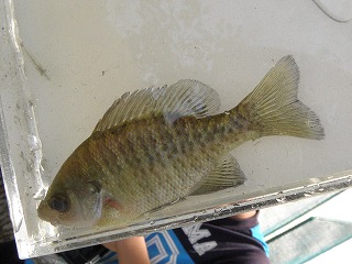 【左】カマツカ 、コイの仲間でヒゲがある           【中】タイリクバラタナゴ(外来)            【右】ブルーギル(特定外来)
