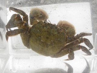 【左】カダヤシ、上が♀、下が♂(特定外来)           【中】モクズガニ、シャンハイガニに近い仲間です。        【右】藻屑が付いたモクズガニの♀