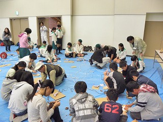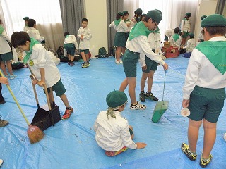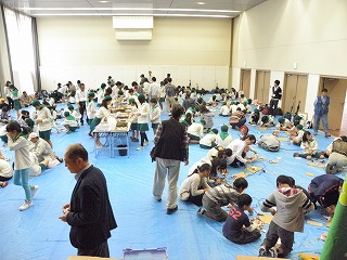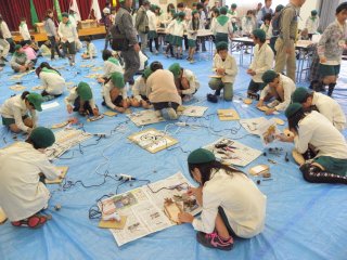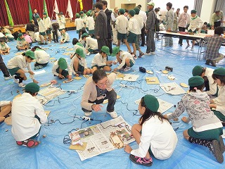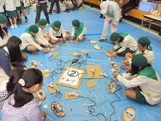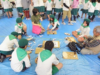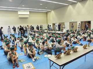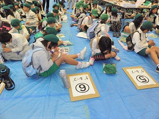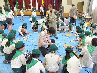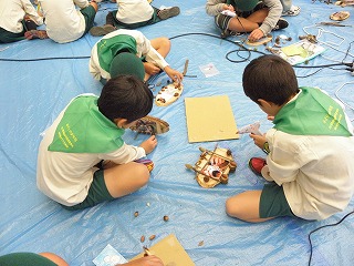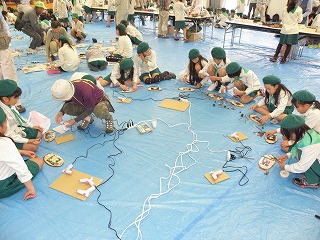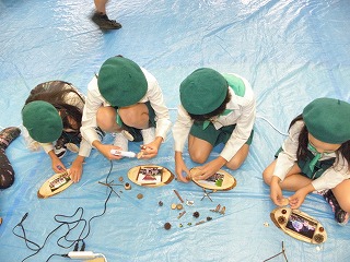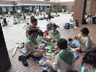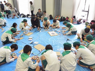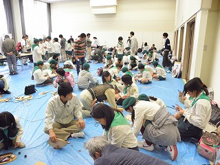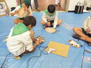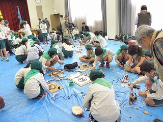 少年団のメンバーの年齢が大きい人が多かったせい?か、狭いホールでの顔合わせと、簡単な説明のあとの工作、というあわただしい日程にもかかわらず、手際よく、アイデアよく、写真立ての作成もすすみ、時間通りにでき、机の片付けや掃除までやってくれるという姿に、指導員一同感心したという声が上がった。例年通り、数人のやけどもあったが、大したことはなかった。思い思いの写真立てを脇に置いて、閉会式後、雨の上がった会館回りで弁当をほおばる姿が見られた。(記・竹内秀)