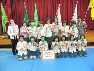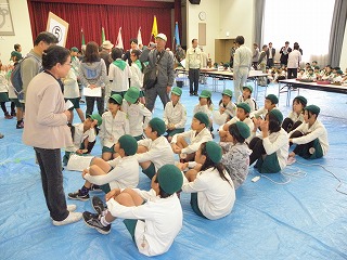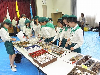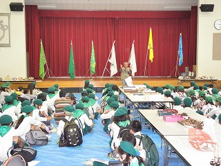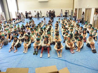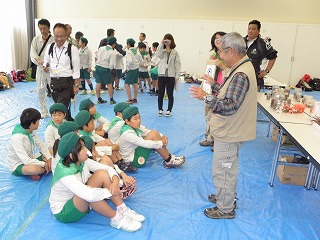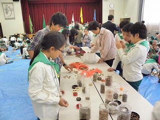 前の週に、伊豆大島に大災害をもたらした台風26号が去り、土曜日は絶対に晴れると信じていたのに、つぎの台風が近づいている影響で朝から雨。みどりの少年団交歓会を開催する農林水産事務所は、前日から天気予報をにらみながらも、何とか午前中の観察会はやりたいと、中止の連絡は無し。ところが、8時半には雨脚は強くなるばかり。9時直前になって、観察会の中止と、文化センターでのクラフト工作開催の午前中日程を決定。天気によって、集合場所が異なる計画であったにもかかわらず、時間通りに各市町の少年団は集まり、開会式はスタートした。