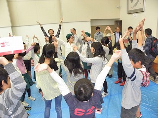【左】まず、リラックス、準備体操 【中】グル-プ別にリーダーと対面、自己紹介 【右】グル-プ別にリーダーと対面、自己紹介