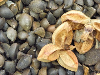 【左】カボチャの種子 【中】ヤシャブシの球果 【右】ヤシャブシの花殻