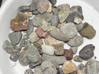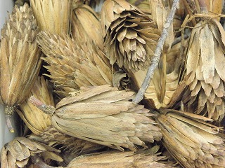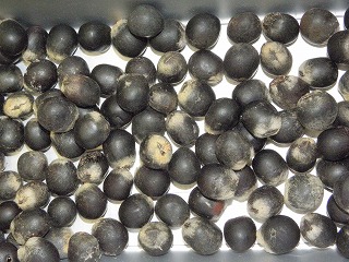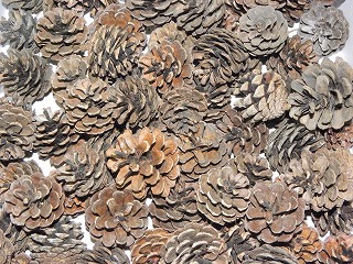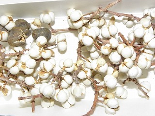 【左】大きいのがジュズダマ。小さいのがハマゴウの種子 【中】ハマゴウの種子 【右】カラマツのマツカサ