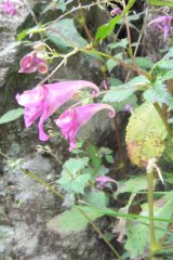 【左】ツリフネソウ、左。キツリフネソウ、右 【中】ギョウジャノミズ 【右】タチツボスミレ(返り咲き)