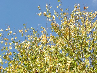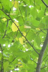 【左】ホウノキの葉と果実 【中】カツラと月齢13日の月 【右】フサザクラ(1種1属)