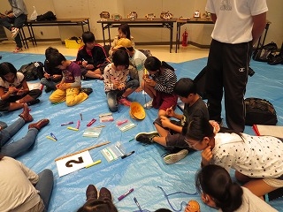 あいにく、雨模様の天気となりました。例年、野外で自然観察や野外ゲームをして自然の大切さを実体験で体を通して学ぶことを行っている所ですが残念な日になりました。今年は、武豊町運動公園で自然観察と樹木名を作成し、木に取り付ける予定でしたが、雨天バージョンの武豊中央公民館講堂で写真立て作りを行うことになりました。