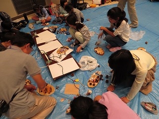 作り方の説明の後、班に分かれ、名札を製作し自己紹介してから始めました。材料は知多自然観察会の会員が集めた多種の材料を使い、それぞれ思い思いの傑作が沢山できました。最後に、満足顔で記念写真を撮りました。