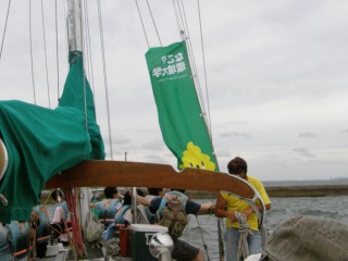 海の生き物と私たちの生活はどのような繋がりがあるか事前に学びフイルドに出て確かめました。ヨットで佐久島への途中、漁をしている船を見ました。漁船お回りには漁で水揚げした海の生き物のおこぼれをいただこうとカモメやウミネコの群れを見ました。佐久島に行く途中、一瞬ですがスナメリの黒い影を見ることができました。行きは向かい風で少し白波が立っていたのでしぶきを浴び、潮の味を楽しむことが出来ました。佐久島での海辺の生き物観察はいかに掲示してありますのでご覧ください。(記・降幡)